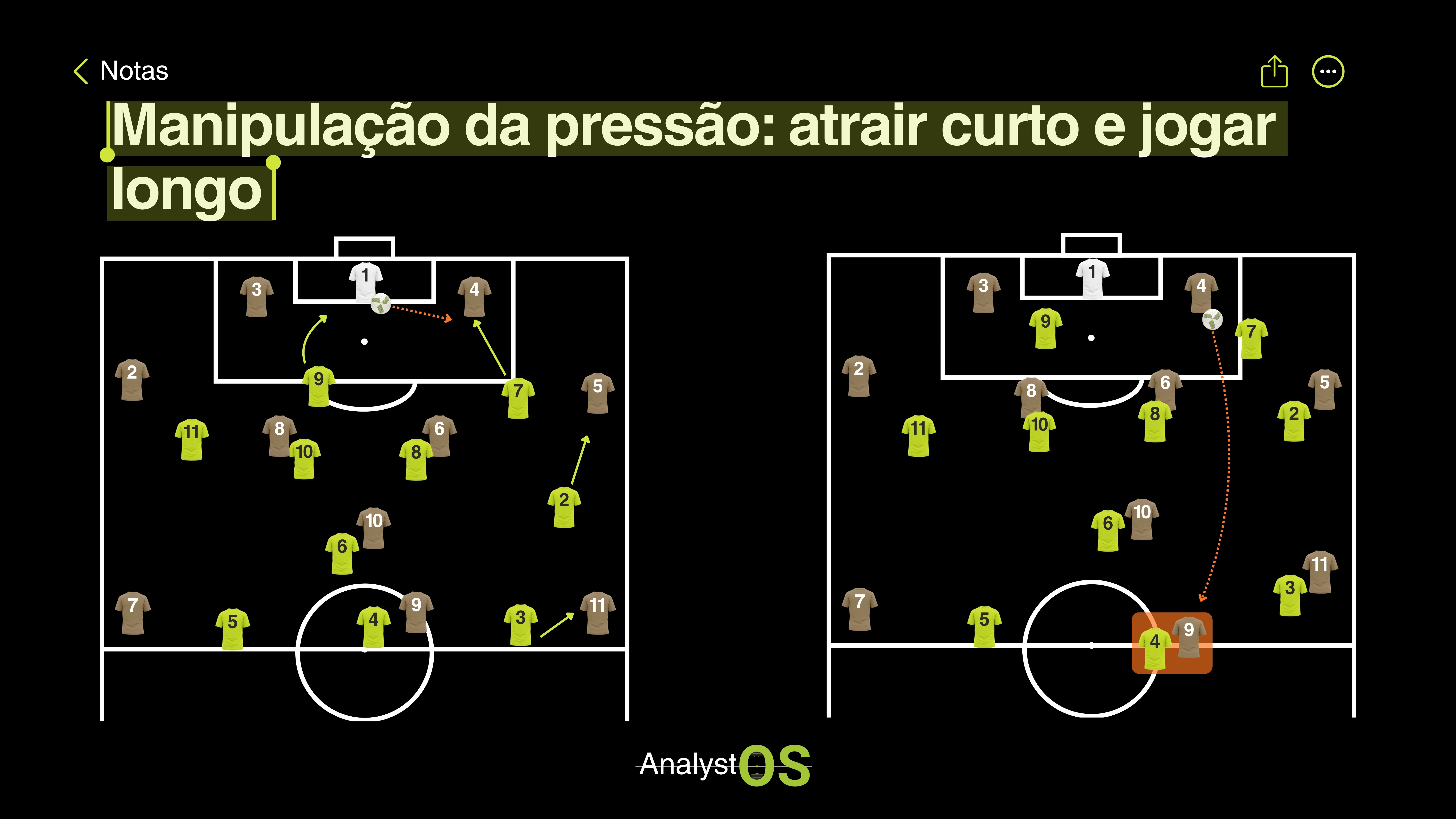 Vemos este padrão com frequência em equipas como o Manchester City, por exemplo: a construção curta inicial atrai a pressão alta homem a homem, e a mudança súbita para o jogo direto, para o Haaland, obriga o adversário a reorganizar-se rapidamente num bloco mais baixo, um momento em que as referências ainda não estão estabilizadas.