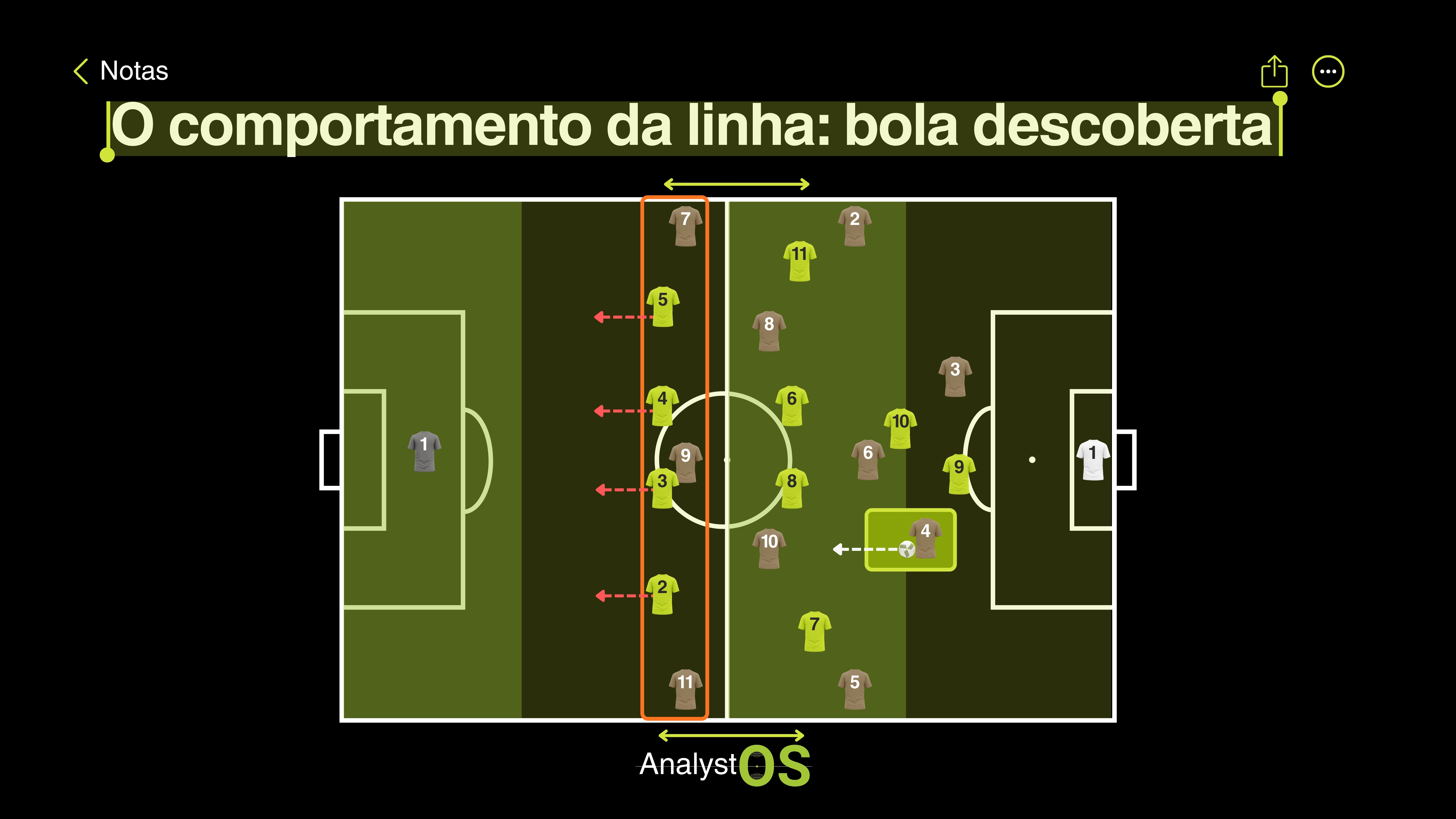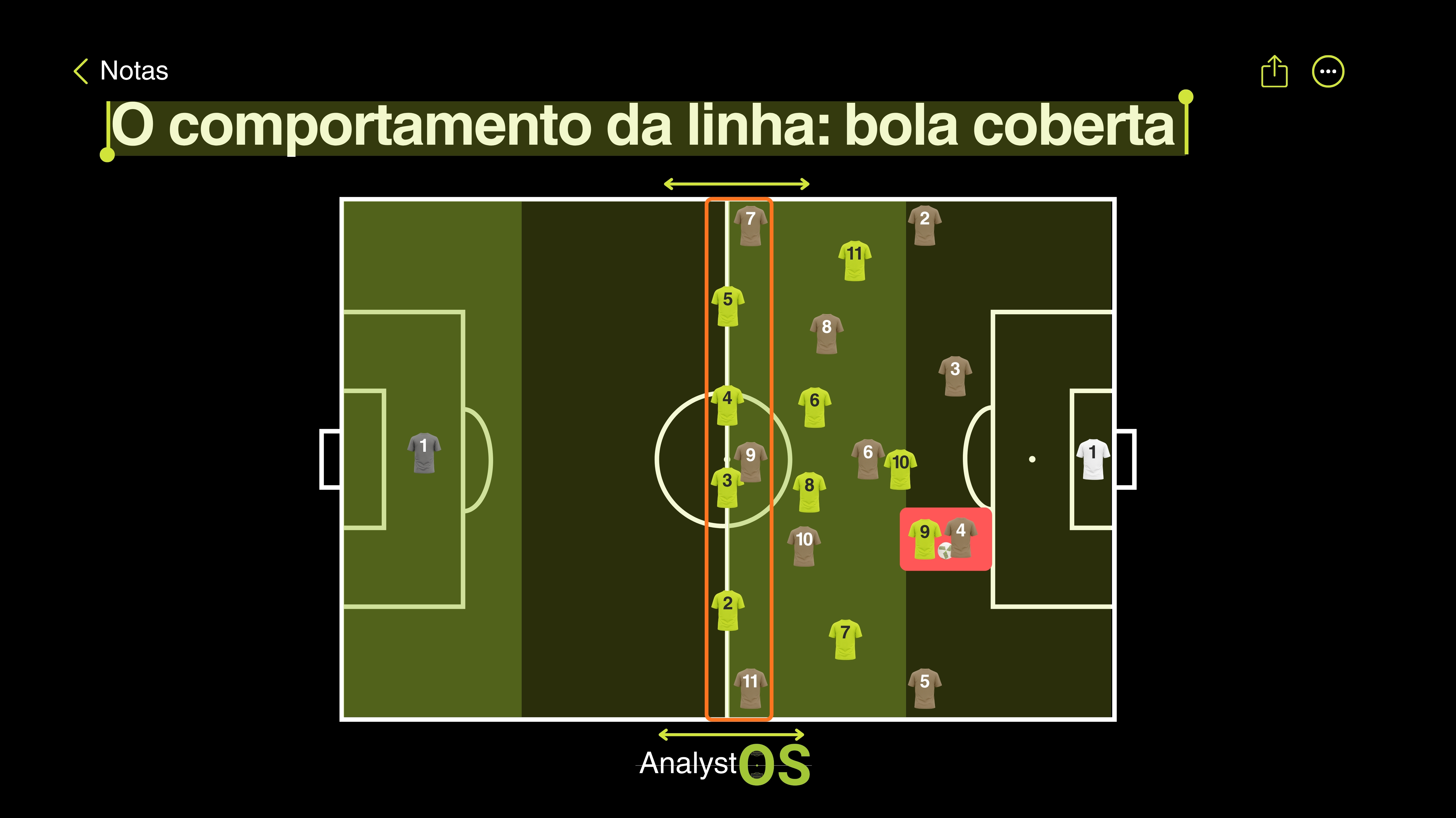 Quando a bola está coberta, ou seja, sem condições de progredir em direção à baliza de forma direta, a linha sobe, encurta o campo e fecha o espaço entre setores.