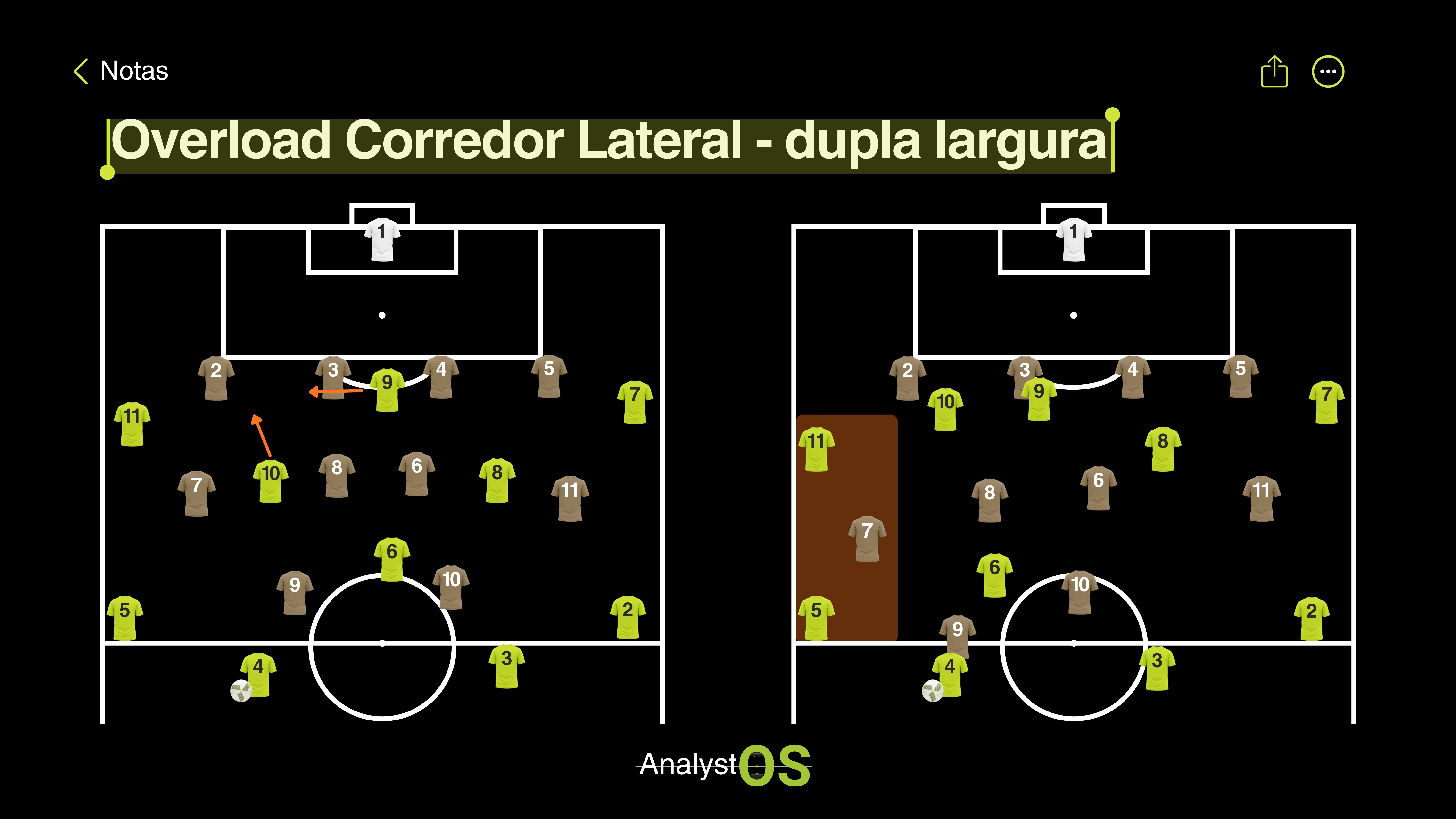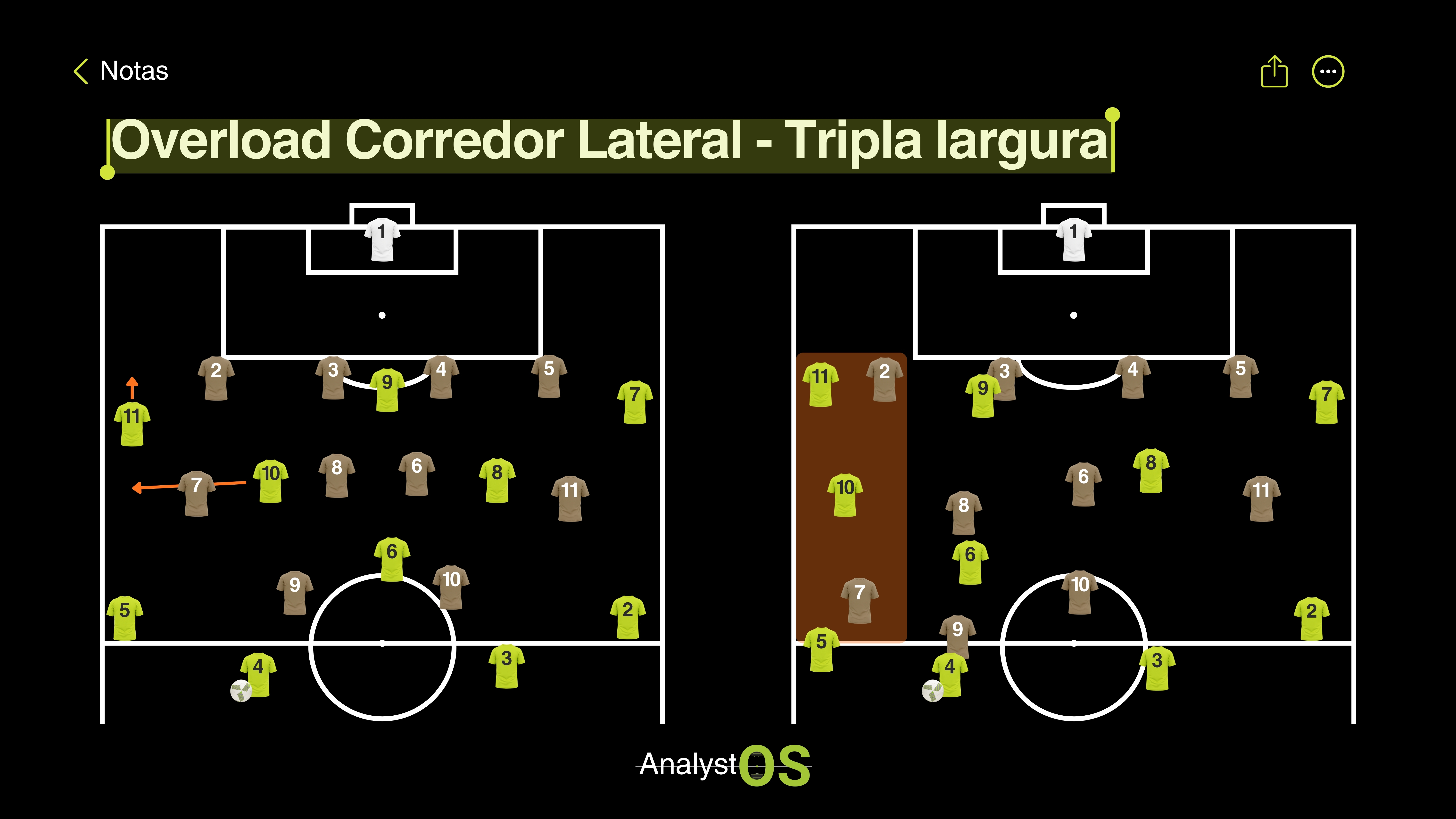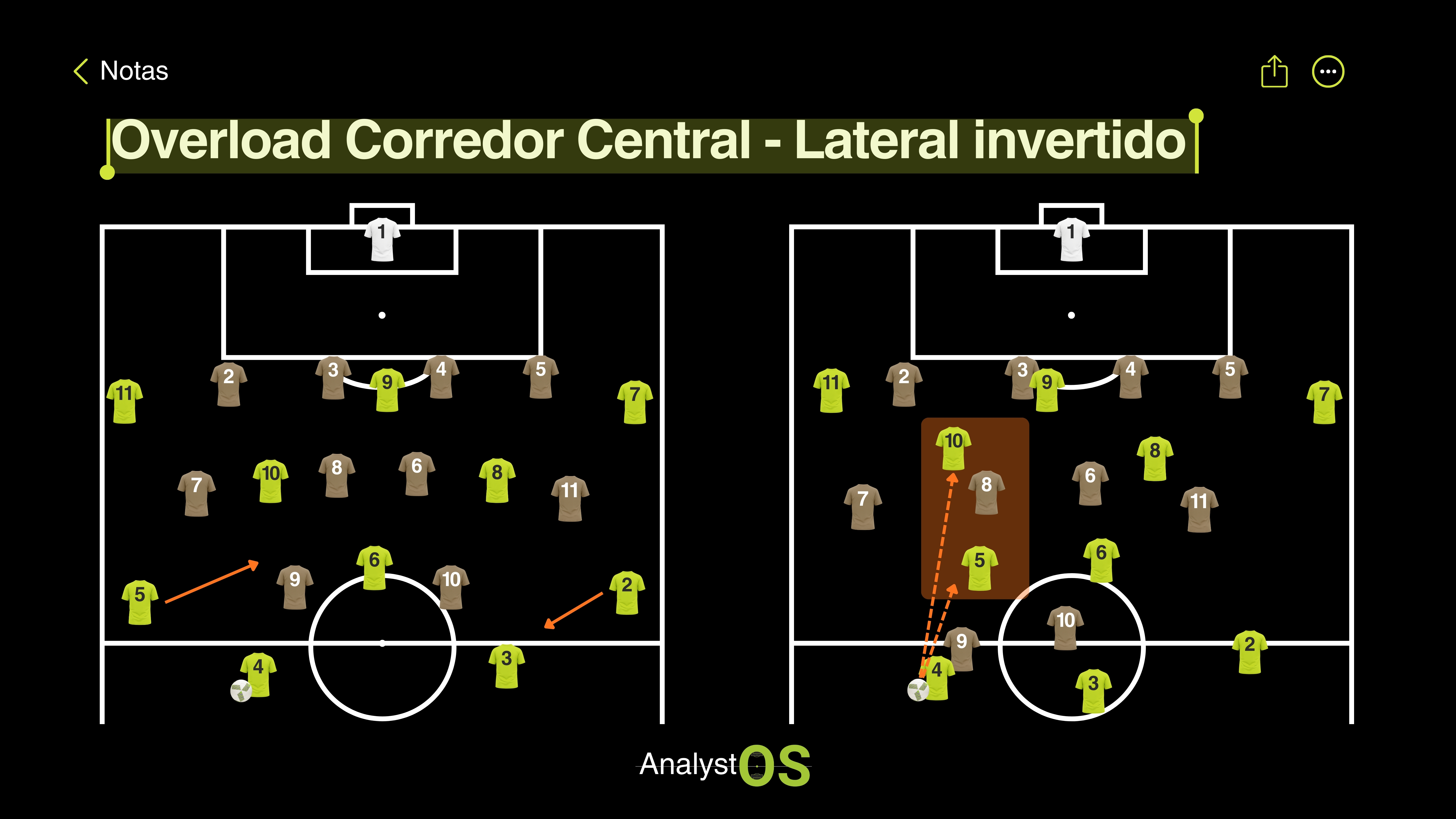 Este é o momento-chave do overload que não se constrói apenas pela soma de jogadores na ala, constrói-se pela criação deliberada de um conflito de referências entre lateral e central.