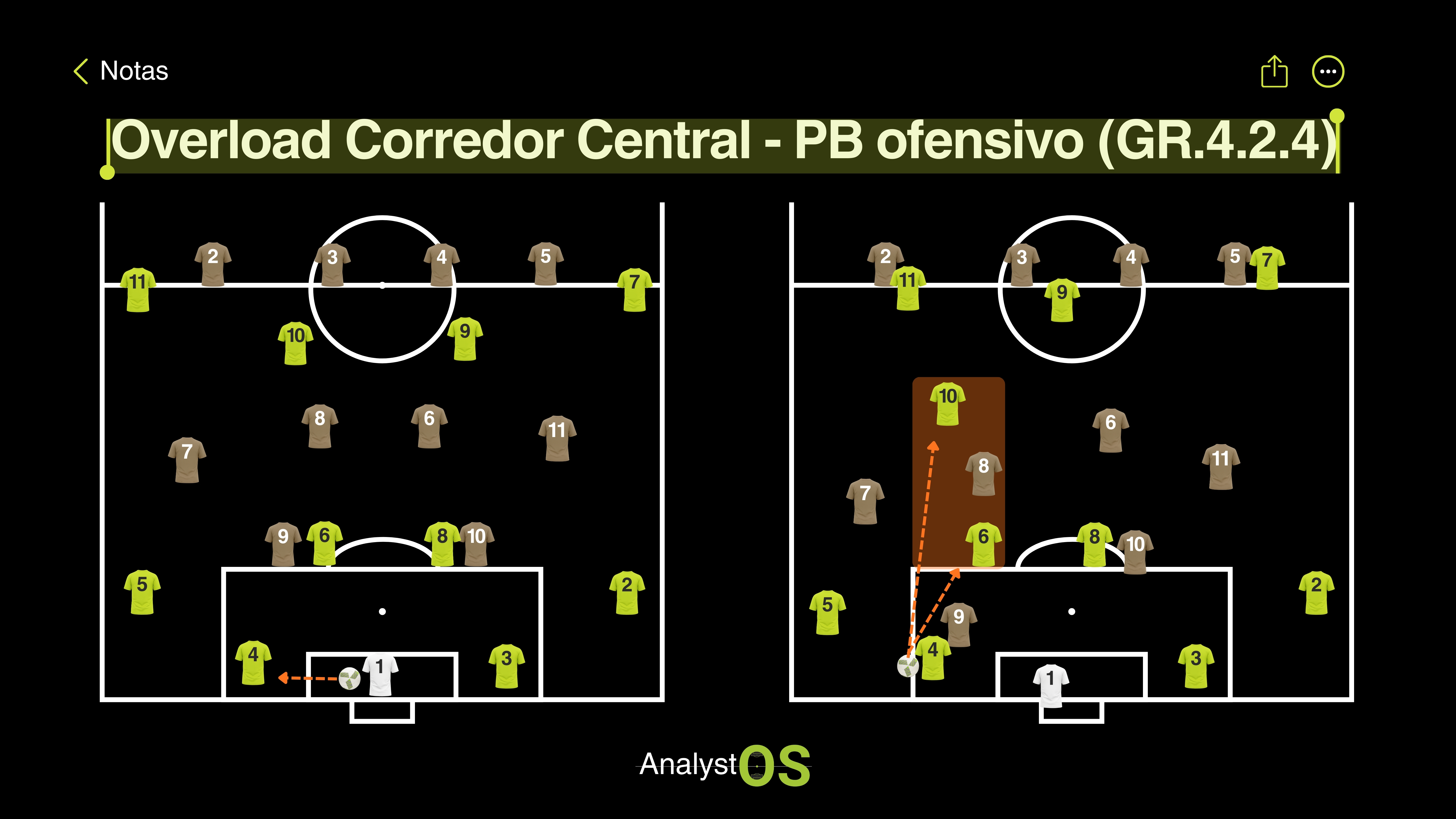 Ao contrário de outros tipos de overload, aqui a superioridade não nasce apenas da acumulação de jogadores por dentro, mas da saída deliberada de um elemento da última linha ofensiva para zonas entrelinhas.