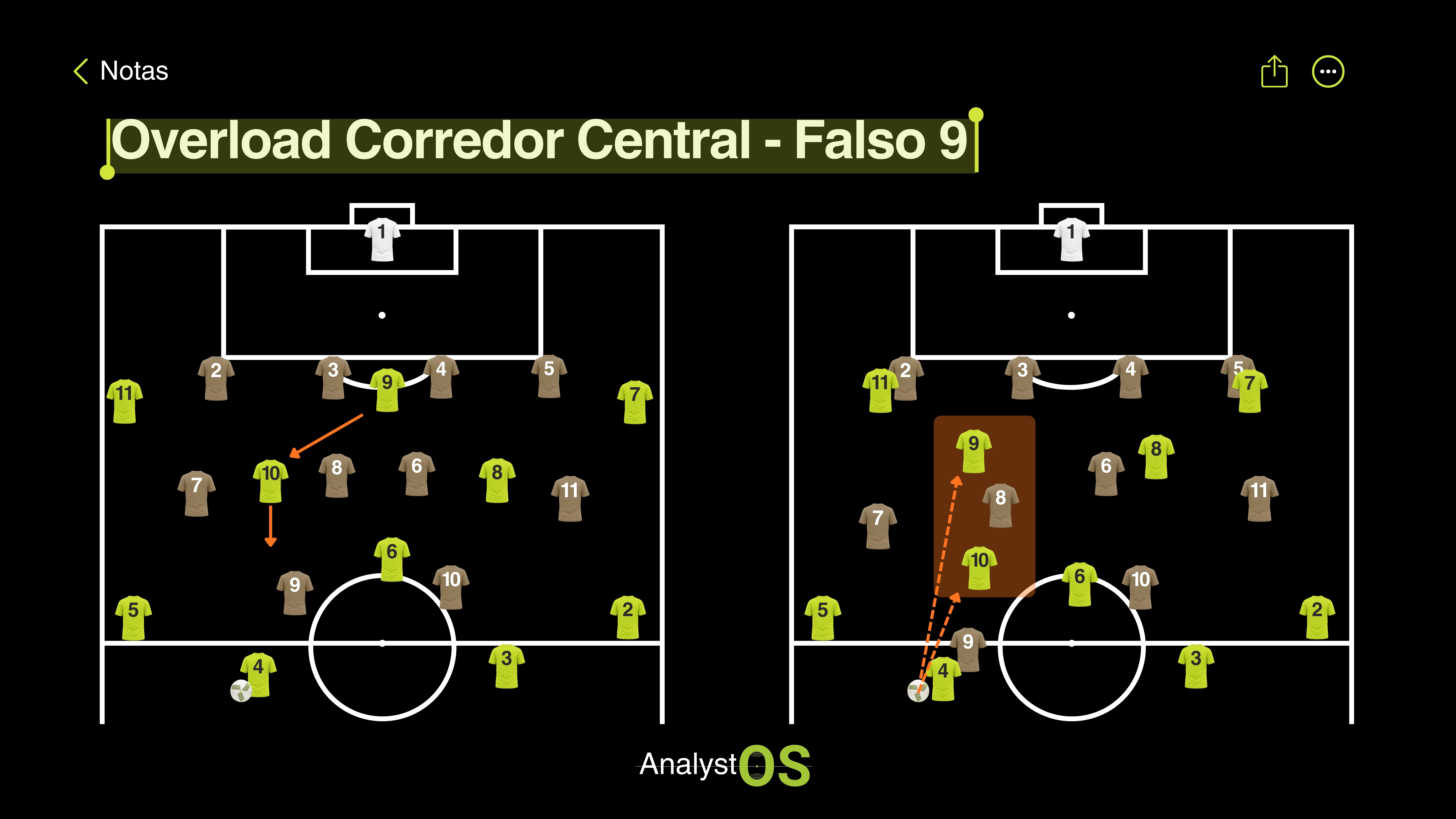 ➡️ se ninguém acompanha, o falso 9 recebe entrelinhas com tempo e enquadramento, reforçando o overload no corredor central e permitindo jogar de frente para a última linha;