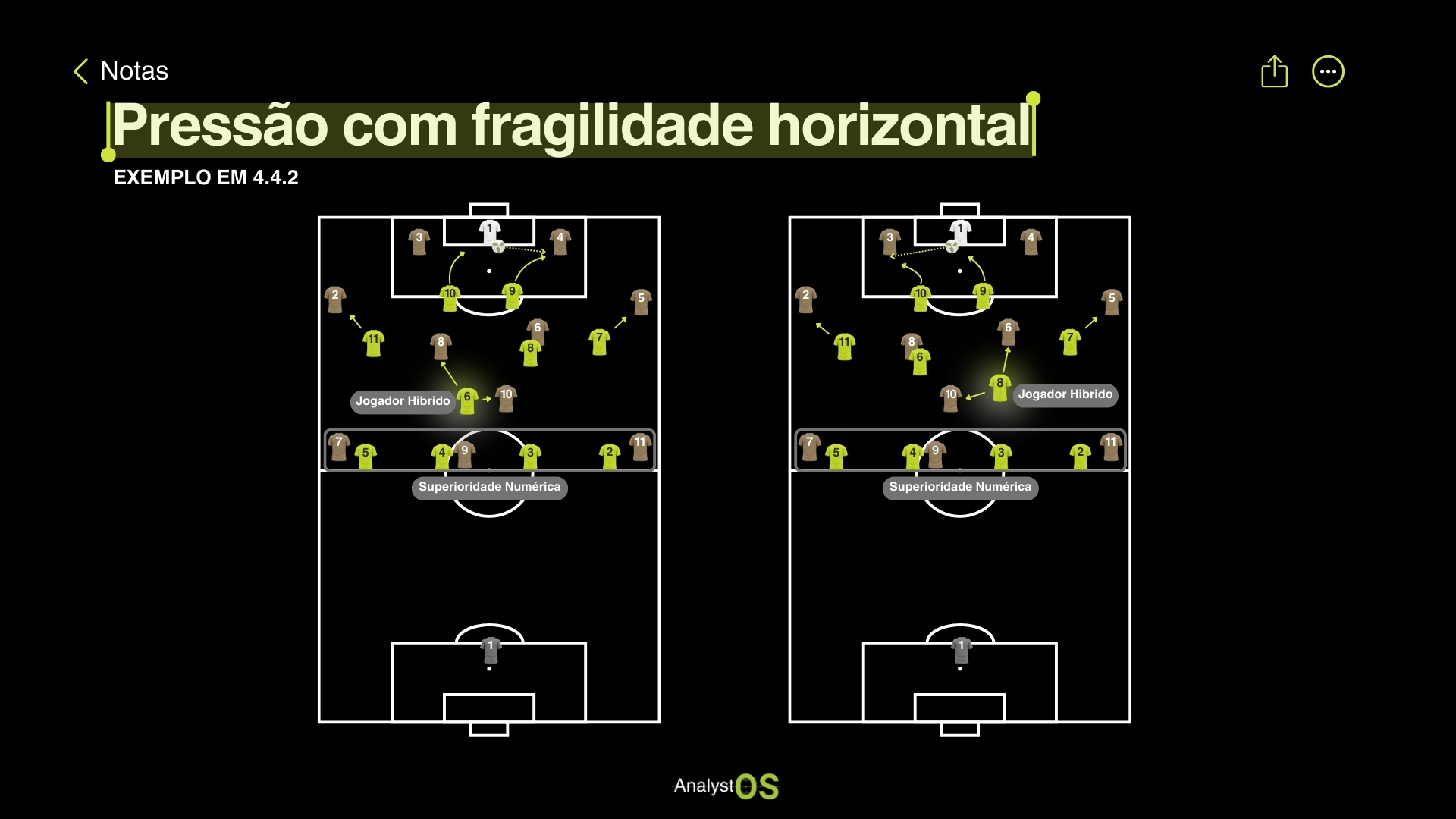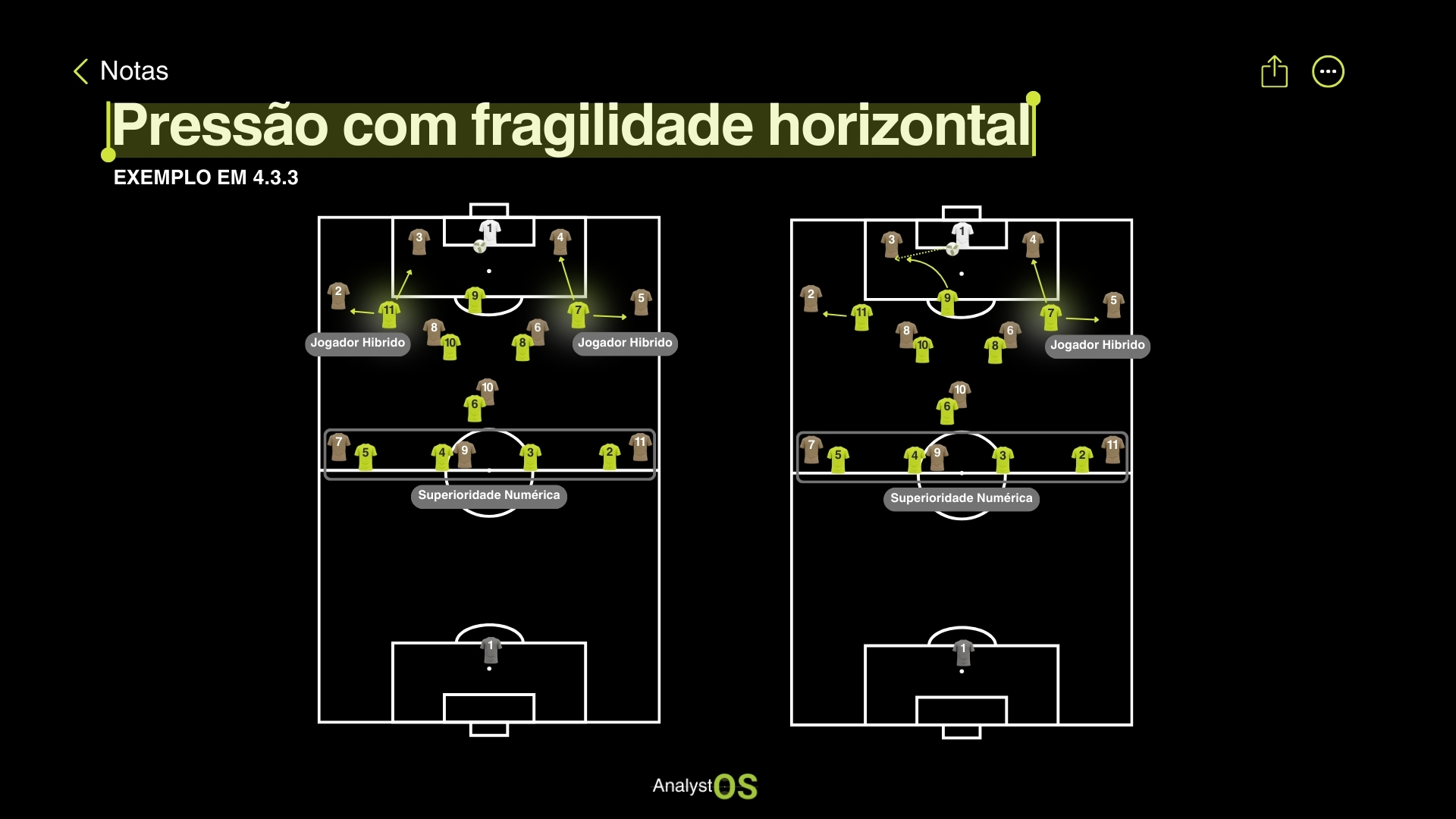 Outro ponto-chave é identificar os jogadores híbridos, aqueles que dividem a atenção entre dois adversários ou entre um adversário e um espaço, e que saltam no momento certo. Eles são o motor da pressão híbrida e a chave para compreender a engrenagem defensiva.